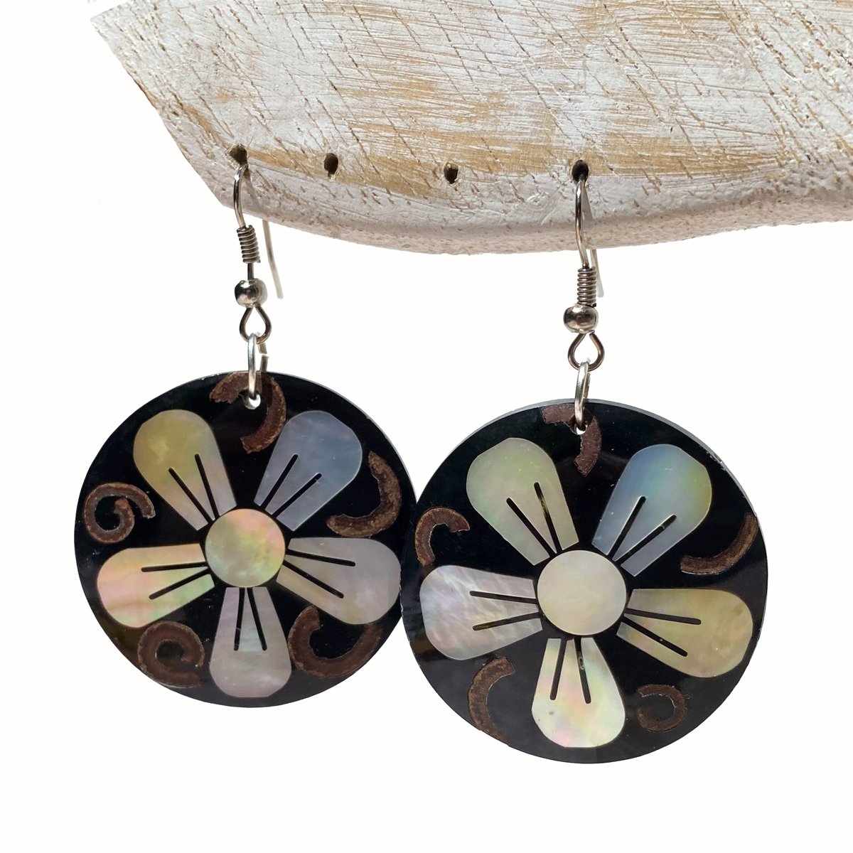 Boucles d'oreilles rondes, nacre grise et résine rouge et corail, artisanat de Bali.