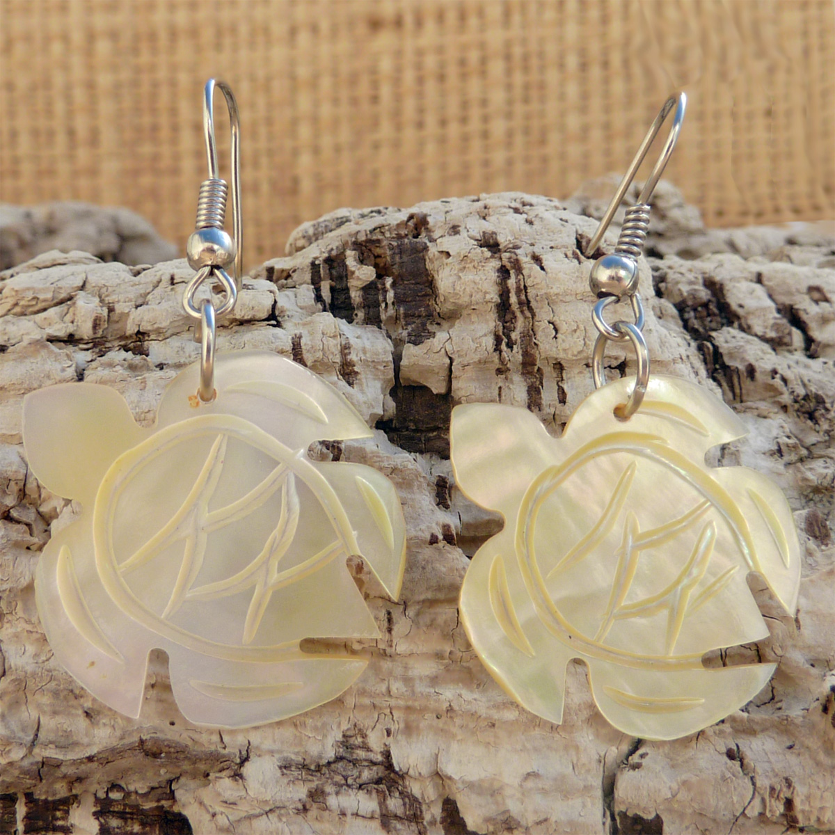 La nacre étant un matériau naturel et ces boucles étant réalisées artisanalement, paire par paire, les nuances et dispositions des nacres varient légèrement d'un exemplaire à l'autre par rapport à la photo.