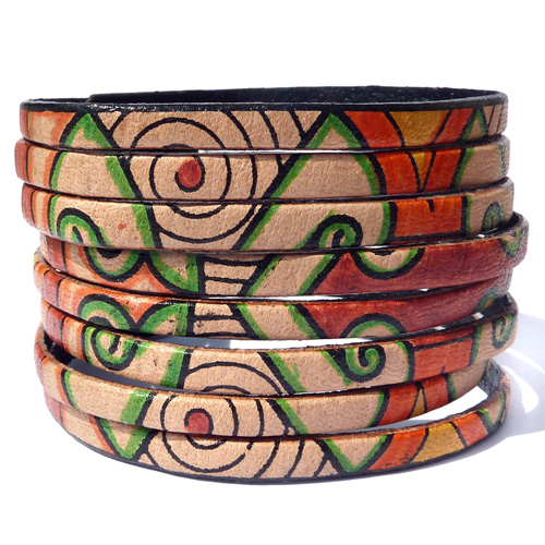 Décor à motifs dans les tons rouges, orangés et bruns, dans un style à la fois ethnique et imaginaire.