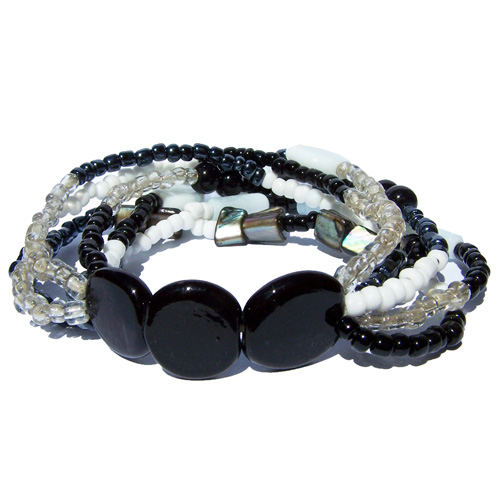 Ce bracelet souple constitué d'un support en tissu est entièrement brodé de petites perles de rocailles noires et blanches, avec un motif en perles gris métal et transparentes.