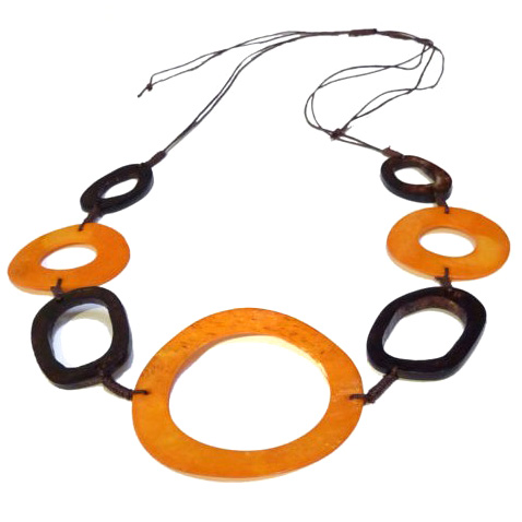 Ce collier est constitué d'anneaux ronds et ovales ajourés en os teinté reliés par un cordon de coton marron.