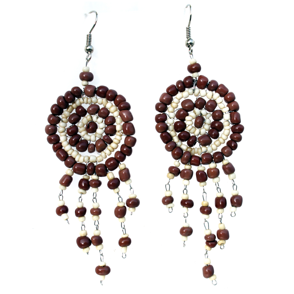 Collier original, mi-long en perles de rocaille, composé de rangs de perles panachées marron rouge brique, tique, de perles en bois et d'un pendentif rond en bois naturel.