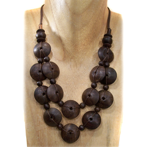 Deux rangs de grosses perles en bois "soucoupe" et de perles en bois rondes.