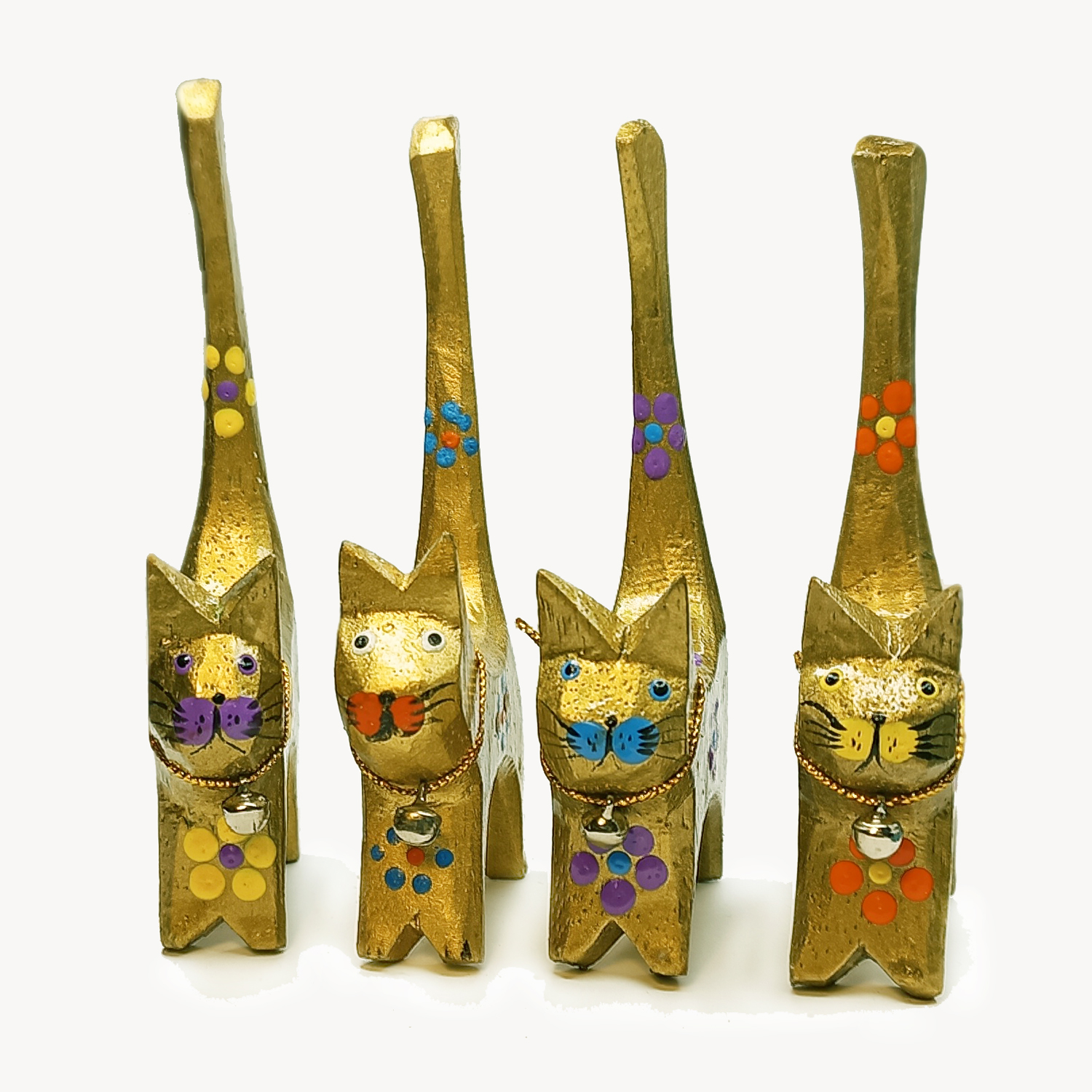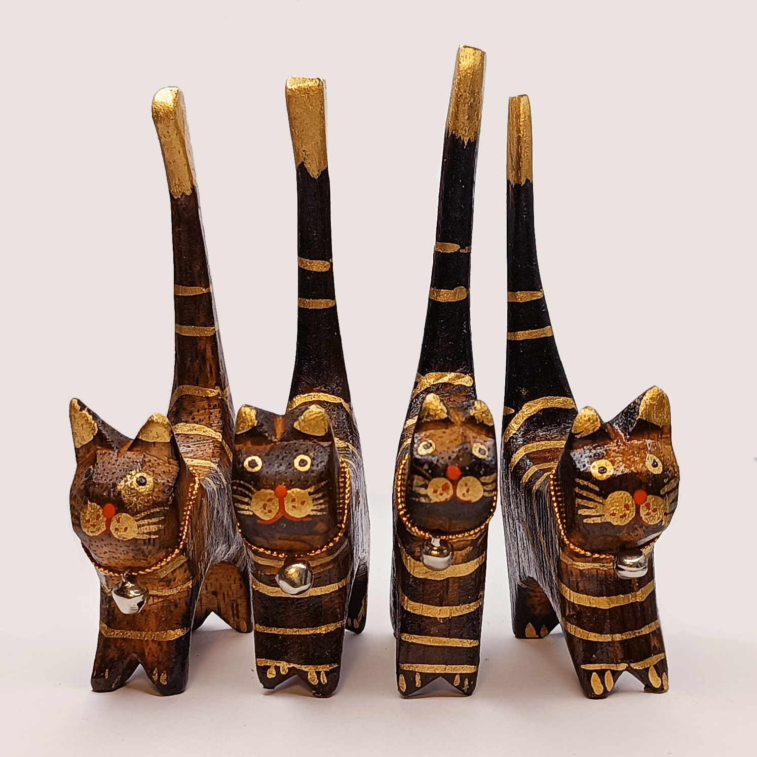 Quatre petits chats en bois léger, peints à la main, couleur jaune, décor rayures.